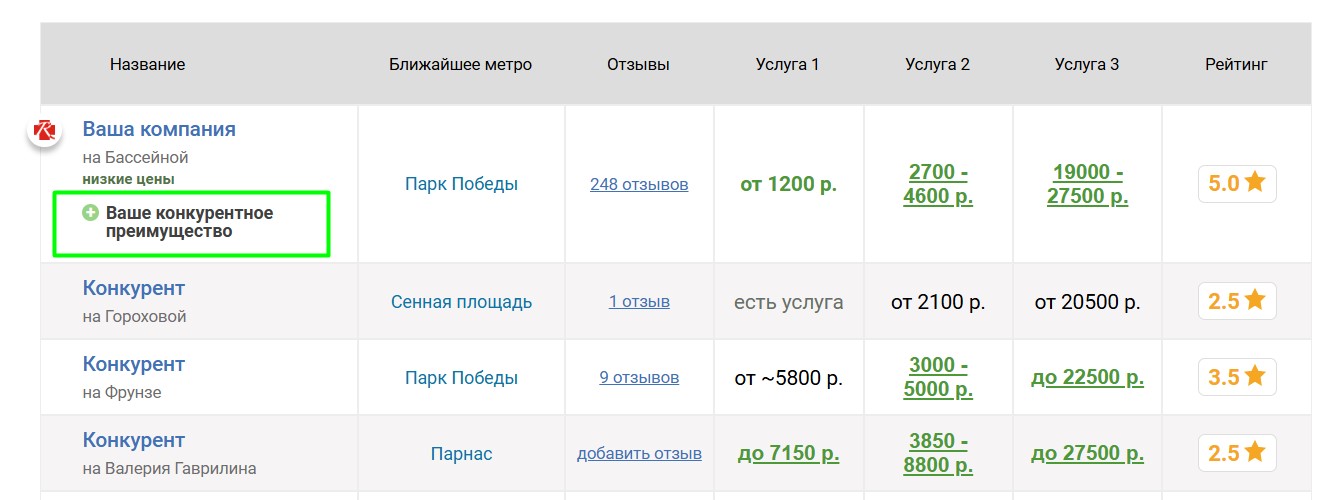Если компания имеет конкурентные преимущества, мы можем их опубликовать на странице сауны и показывать в таблицах в соответствующих страницах. Преимущества можно гибко настраивать для разных услуг. Правильная публикация преимуществ существенно увеличивает интерес клиентов, так как выделяет сауну в таблицах и показывает, почему следует обратиться именно туда.