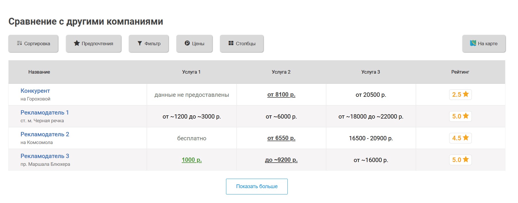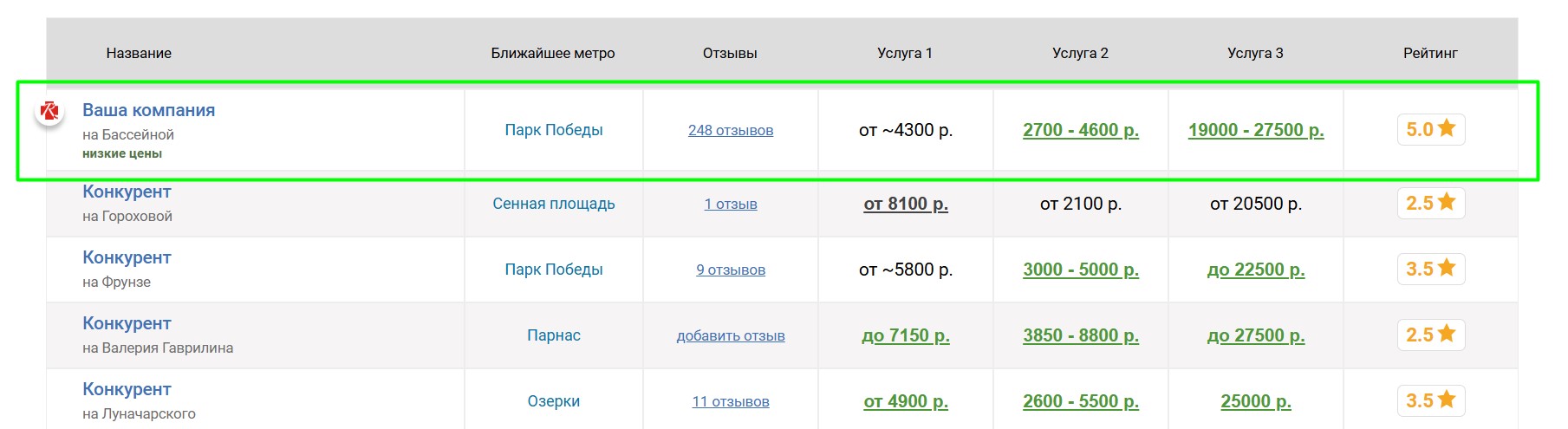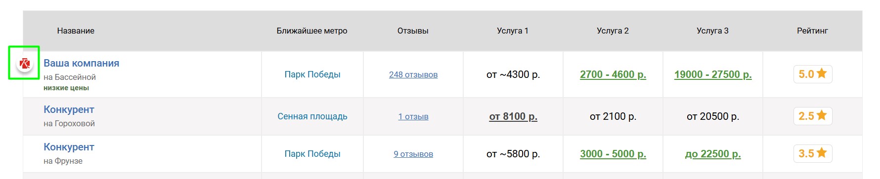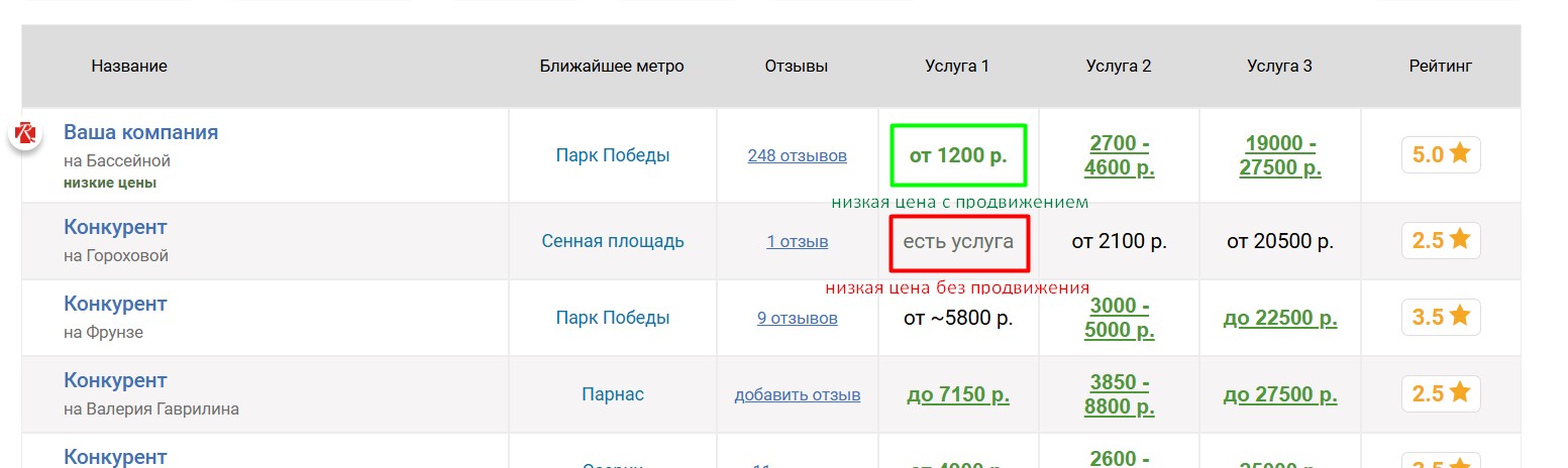 Вокруг продвигаемой таким образом сауны выбирается некоторое количество ближайших конкурирующих саун, продвигаемая сауна попадёт к ним в таблицу «Сравнение по ценам», которая выглядит следующим образом: